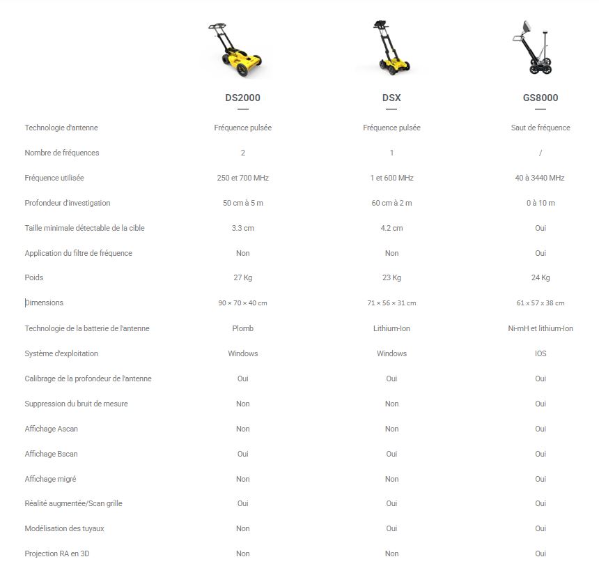 Afin que le comparatif entre ces trois géoradars de canalisation soit le plus clair possible, nous avons choisi de différencier les caractéristiques propres au procédé