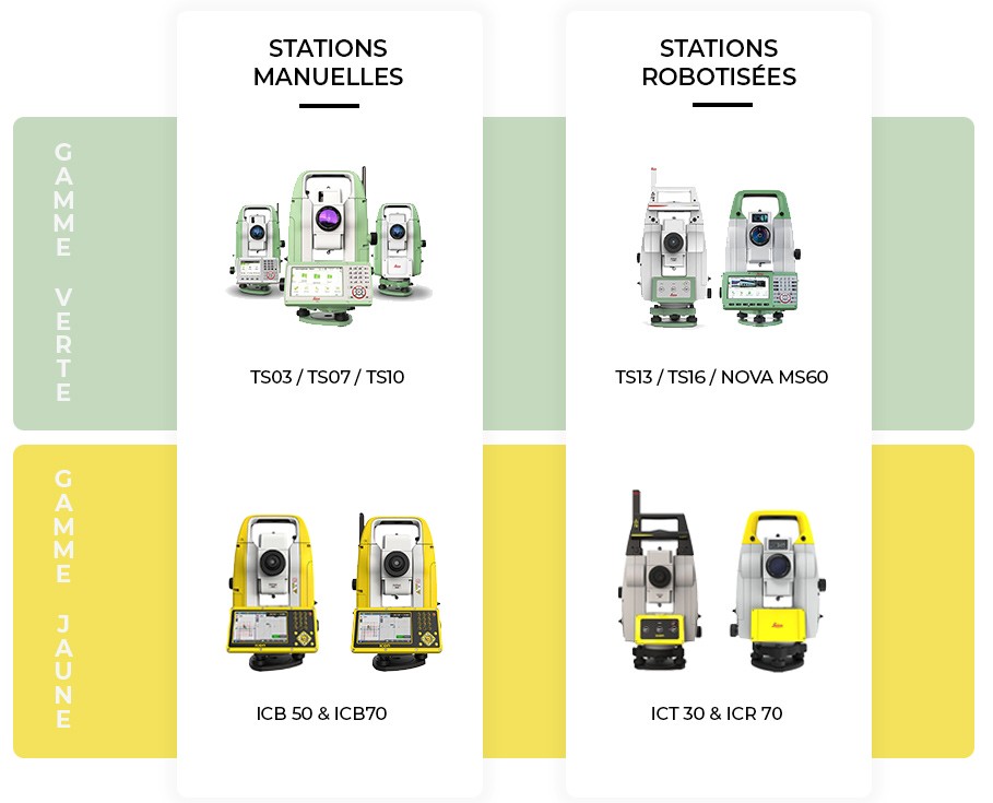 En topographie, il est fréquent de ranger des instruments dans des gammes différentes pour les différencier selon leur prix ou encore leur degré de technicité ! Pour les stations totales, nous identifions la gamme jaune et la gamme verte. Chacune des gammes est composée à la fois de stations manuelles (2 intervenants nécéssaires), et de stations robotisées (1 seul intervenant suffit).